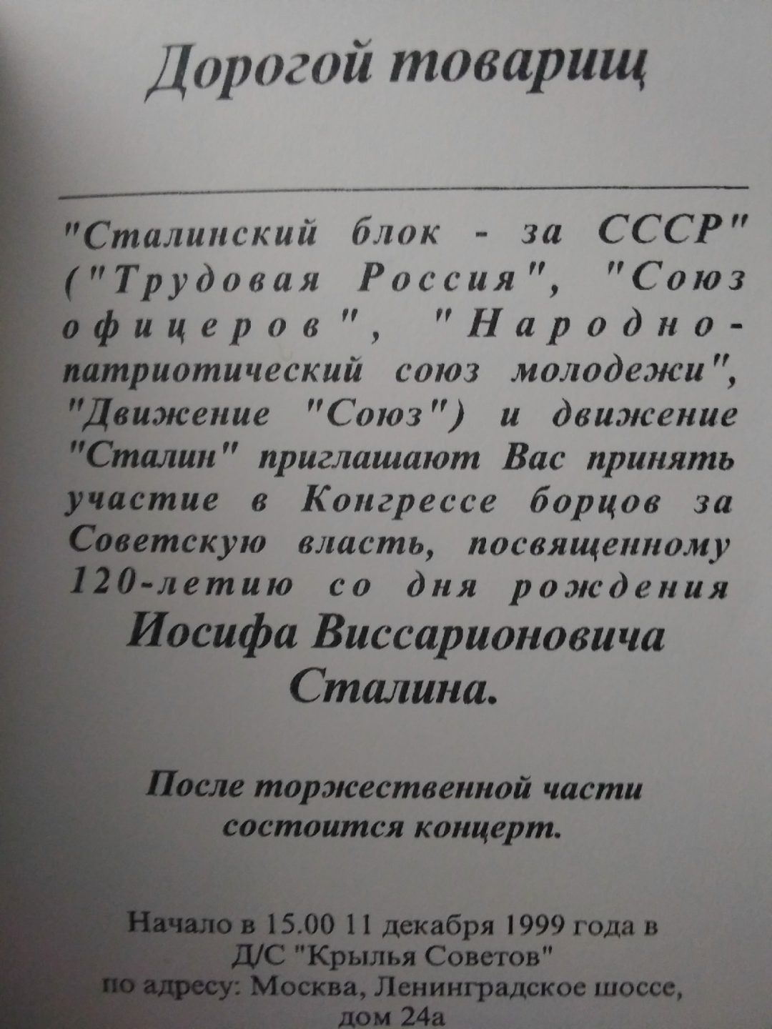 Так, в 1999-м я узнал на концерте Г.О. и «28 Панфиловцев» в ДК «Авангард», что есть такой Сталинский блок за СССР (см. выше), голосовал за него на выборах.