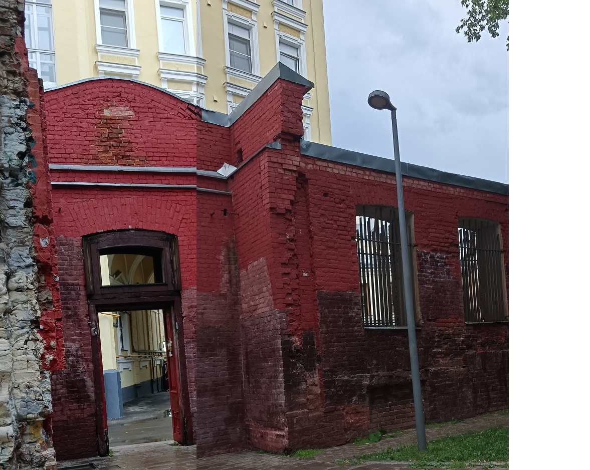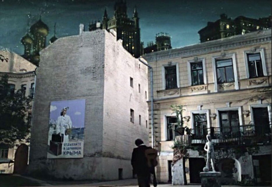 Кстати, вот как выглядит настоящий двор близ Покровских Ворот (но находящийся уже на Маросейке, слева — Армянский переулок), в котором стоят загадочные бордовые, облагороженные развалины, где, возможно, и обитал юный Леонид Зорин у своей тётушки в коммуналке (образ Маргариты Павловны, как Зорин рассказывал в 00-х, был списан с натуры — более того, она продолжала здравствовать в 21-м веке). В этот двор направляет с седоком-Костиком свой мотоцикл неутомимый Савранский, а выезжает уже из готической арки близ «Кропоткинской» (сравните композицию двора с первым, верхним кадром из фильма, где арка слева с готическим сводом).