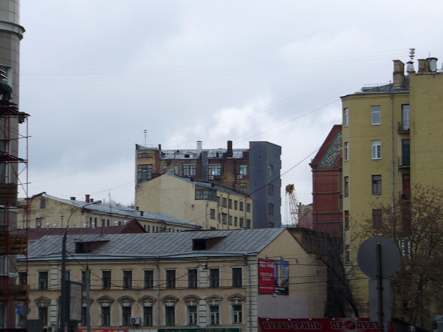 Вот круглая, типично конструктивистская колонна левее щеки Бодрова — это опора балконного выступа, который располагался с левого края здания по Нижнему Кисельному переулку. Левее выступа на двух опорах — вход во двор. На левом втором фото выше (где в правой части — снос) — дальний дорожный знак разрешённой стоянки располагается у этого выступа.