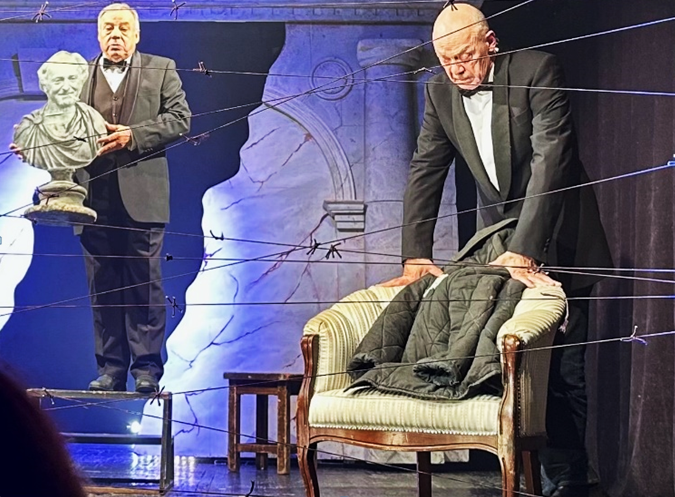 Во-вторых, творческая концепция Марка Розовского демонстрирует сложность человеческой натуры поэта. Один актер изображает внешний облик Бродского, в некоторой степени его публичный образ (Валерий Шейман был одет в классический и строгий смокинг), тогда как второй (Андрей Молотков в черном пиджаке, но в джинсах), олицетворяет внутренний мир поэта, его сокровенные переживания.