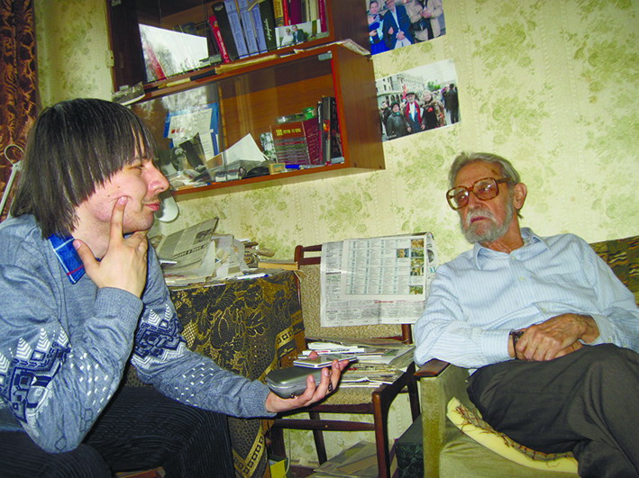 Нужный из трёх дом я опознал лишь по стоящему у окна, словно в раме портрета, знакомому по множеству передовиц профилю – строго, как учитель, к которому опаздывают на домашний урок, глядел сверху товарищ Бушин. Громовой, легендарный критик и единомышленник, которого давно мечтал увидеть лично, но вот даже по заданию припозднился. Со мною, чтобы приобщиться, и Вячеслав Кяльгин, вокалист «Эшелона»: получить как бы самой встречей благословение на запись песни «За Советскую Родину!» (в середине её — бридж из «Сталинградской хроники» Ю.Кузнецова). Встретил дружелюбно, пригласил садиться. Со скромных стен рабочего кабинета глядят пристально, без рамок ксерокопированные фотографии Маяковского рядом с молодым, щетинистым Кобой…