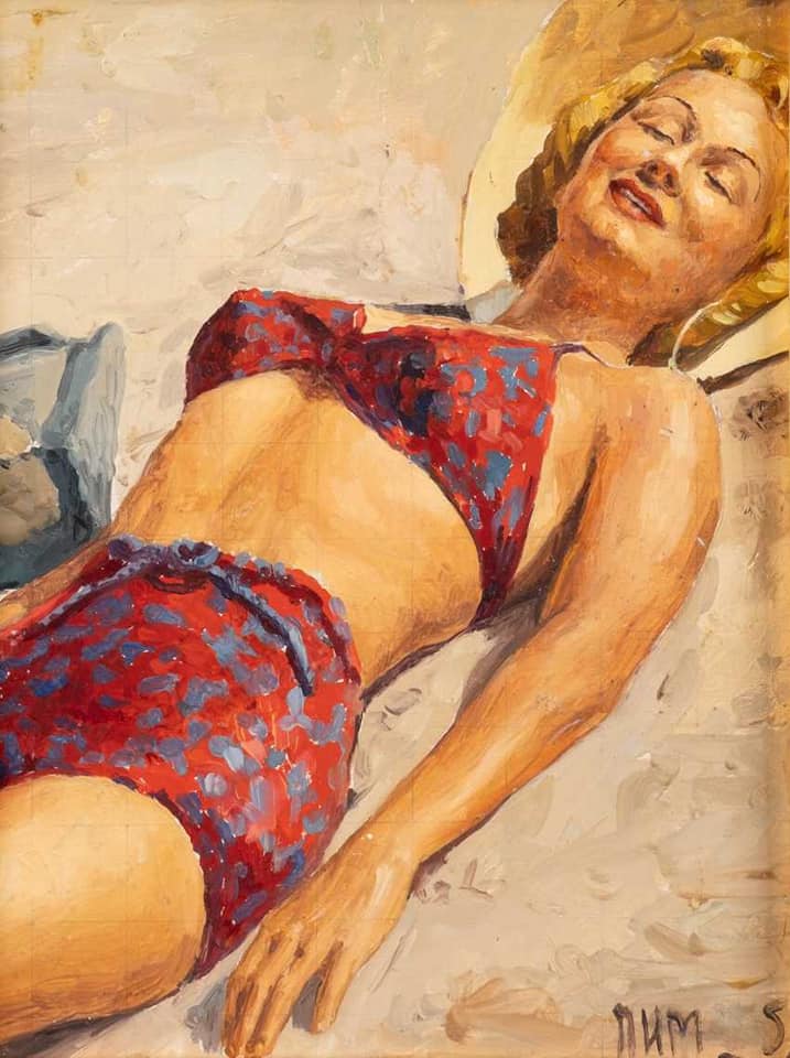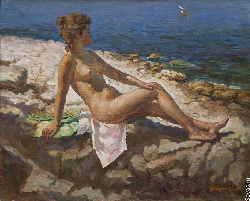 Теперь вернёмся к красоте телесной, которой якобы боялись художники-соцреалисты. Вот слева картина-то вроде бы без ню — но что-то неуловимо американское, «отдающееся» (солнцу!) в ней же есть? Красота полнокровной женственности поймана вместе с духом времени здесь.