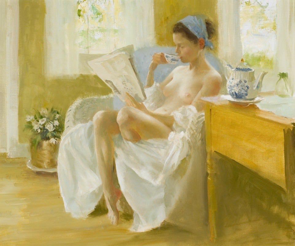Теперь вернёмся к красоте телесной, которой якобы боялись художники-соцреалисты. Вот слева картина-то вроде бы без ню — но что-то неуловимо американское, «отдающееся» (солнцу!) в ней же есть? Красота полнокровной женственности поймана вместе с духом времени здесь.