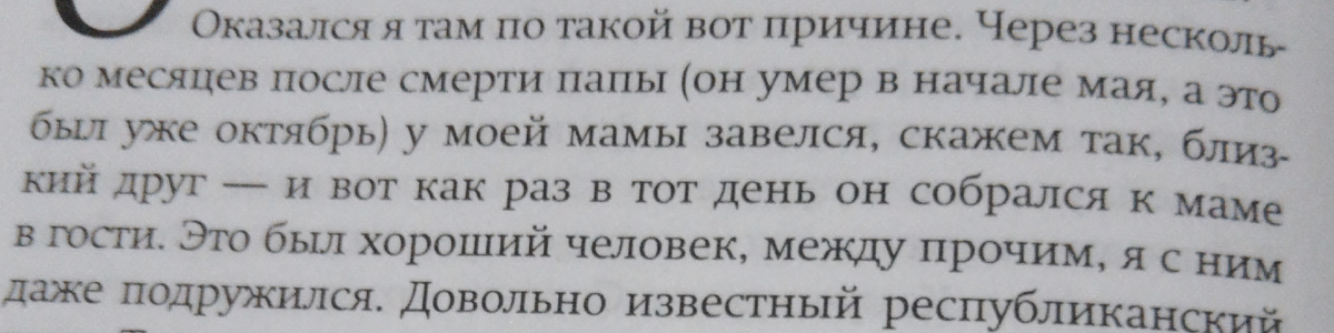 Пугает другое. Автору 75 лет. В этом возрасте описывать свои удачные и неудачные гусарские похождения молодости как-то странно. Делиться ими не по секрету, а со всем светом — не признак нравственного здоровья. Тем более вплетать в эти мемуары маму — кто из поэтов оставался у неё ночевать после ухода из жизни папы. Как-то не очень-то гуманно. Согласны, читатели?